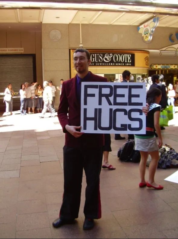 我説你説得對,但是“Free Hug”是由澳大利亞人 Juan Mann 在2006年自主研發的開放世界公益行為藝術活動,此舉旨在通過提供免費擁抱的方式喚醒人們對身邊人的關注,用最直接的肢體觸碰傳遞人間真情。在當年,此事亦引發了不小的爭議……