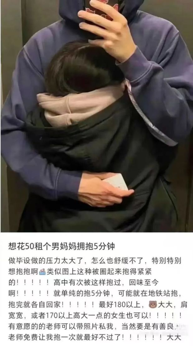 你説你在小紅書看到,有姐妹出價50元拼了一個5分鐘的男媽媽擁抱,效仿的網友好評如潮。