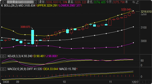 週四(4月10日)大漲近3%,現貨黃金收報3175.32美元/盎司,創下紀錄新高;週五(4月 11日)亞市早盤,現貨獲黃金直線衝高,最高觸及3220美元/盎司,再度刷新歷史高點,美國通脹增速意外放緩拖累美元大跌,國際貿易戰持續推動投資者奔向避險黃金。