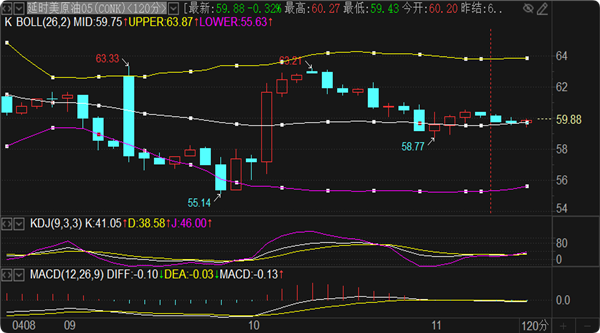 原油即時行情分析:原油就是弱勢,60整數關口來回刺穿,這裏不要有疑惑,趨勢偏空無疑。盤面上週線十字K線控盤,日線MACD綠色量能持續放量,今天就看週四回撤低點58.7位置來判斷強弱,向下破位看4小時SAR指標延伸點57.4,小時布林帶下軌位於56關口,以及本週低點55.1一線。阻力方面關注先看1小時布林帶上軌61和周線布林帶下軌61.5形成的阻力範圍,向上突破看62.5壓力點,至於週三高點63.3和週一高點63.8算是壓制範圍。整體來看原油月線、周線、日線量能都屬於空頭控盤,短期的反彈只要沒能突破65.2之前都不會改變趨勢,操作上劉銘誠建議反彈做空為主,低位做多為輔。