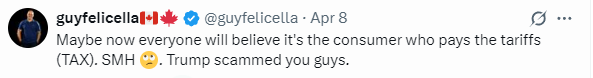 一位加拿大的網友説,“也許現在大家可以相信是消費者在支付關税了吧,嘖嘖嘖,特朗普騙了你們。”