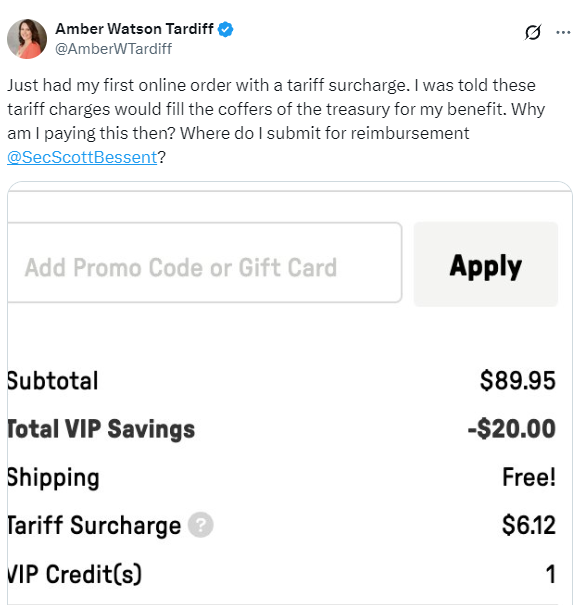 一位美國網友在社交媒體上曬出一張消費單據,上面註明一筆6.12美元的“關税附加費”。這位網友説,“收到我的第一張附有關税附加費的訂單。我被告知,關税將作為我的利益上繳國庫。那我為什麼要再付一筆錢?我該去哪提交報銷申請?@美國財政部長斯科特·貝森特”