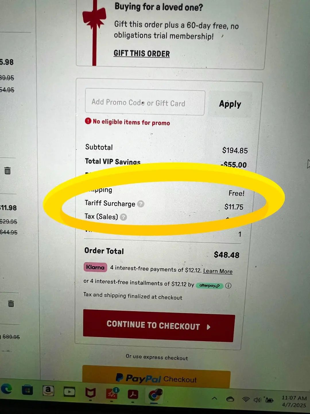 一位美國網友曬出的賬單表明,此次消費被收取了11.75美元的關税附加費。