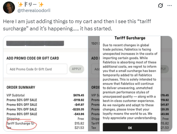 近日,一名美國網友曬出一張服裝公司Fabletics的消費收據,收據上明確標註了一項增收的“關税附加費”。