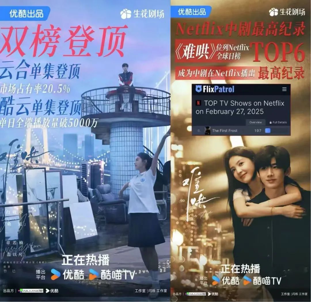 突出的海外成績,更是讓“爆款”有了更多的延展空間,實現了某種意義上的文化影響力。在優酷海外版APP,《偷偷藏不住》累計總榜播放量第一,《難哄》開播當天在所有類型播放量裏位列歷史第一。Netflix上,前者躋身2023年全球日榜TOP13,後者更是攀升到了第六位。Tik Tok上,《難哄》已成為2025播放量第一,正在追趕《偷偷藏不住》的位置。