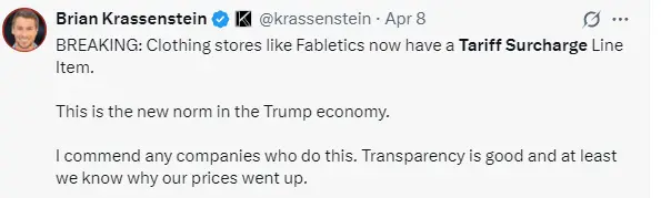 實際上,Fabletics並不是唯一一家直接在賬單上增加關税附加費的公司。據路透社報道,越來越多的美國公司已經或者正在準備採取相同的做法,將自己承受的關税成本轉嫁給消費者。