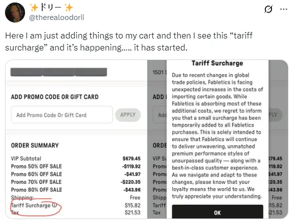 近日,一名美國網友曬出一張服裝公司Fabletics的消費收據,收據上明確標註了一項增收的“關税附加費”。