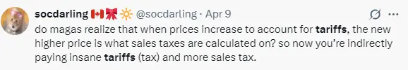 另一位網友則對特朗普的支持者MAGA發問:“MAGA們是否意識到,當商品價格因關税上漲時,更高的售價也是消費税的計算依據?所以現在你們需要支付瘋狂的關税,還有更多的消費税。”