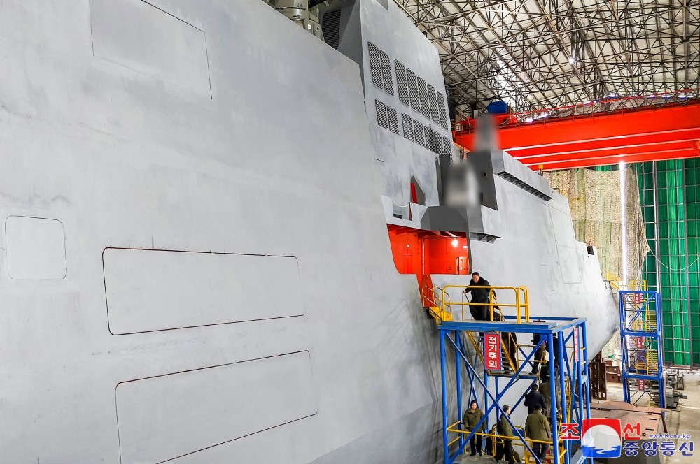 之前這艘朝鮮版的055大驅還停在室內船台上的時候,朝中社拍照也沒拍個全貌出來,都是拍的支離破碎的,以利於保密、讓外界難以發現該艦真實的尺寸、反推該艦的性能數據。