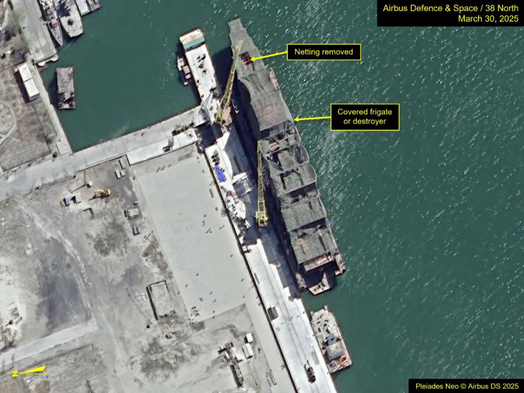 3月29日,西方商業偵察衞星公司發佈的最新衞星照片顯示,在南浦造船廠的碼頭上,出現了一艘前所未有的大型水面艦艇,艦型修長,甚至艦體甲板上還覆蓋着偽裝網。
