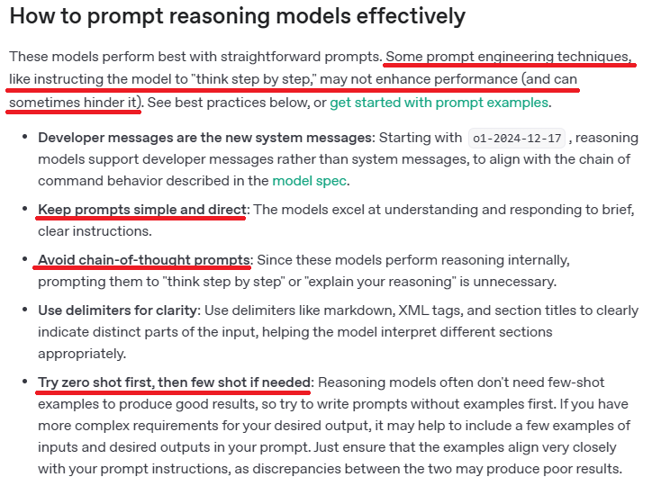 比如 OpenAI 的官方文檔裏,推理模型的專欄下,就明確表示,用過於精確的提示詞,或者是引導思考這類提示詞寫法,反而會讓回答效果下降。