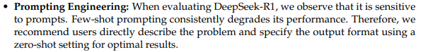 我們還翻了一下 DeepSeek-R1 的官方技術報告,他們在論文裏也這麼説:“DeepSeek-R1 對提示詞很敏感,舉例提示反而會降低模型表現。"