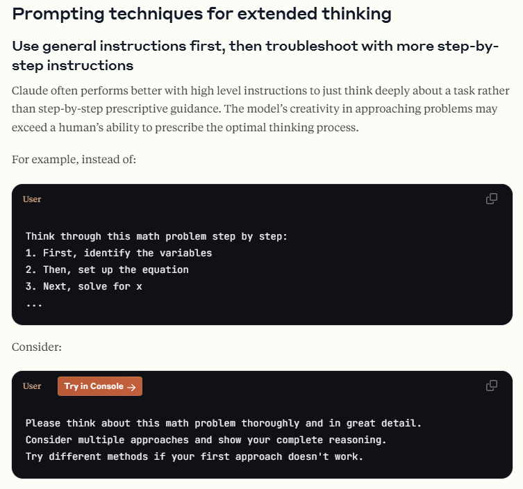 除了 GPT 和 DeepSeek,Claude 3.7 Sonnet 也在官方文檔中表示,比起那些看似很有邏輯,每一步都詳細列出具體做啥的提示詞,他們更希望你直接使喚它。