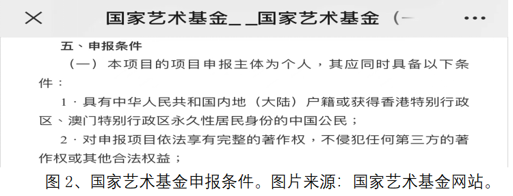 (3) 國家藝術基金除青年項目外,還有一般項目。根據2021年9月13日所發佈的通知,一般項目現在只允許具有中華人民共和國內地(大陸)户籍或香港特別行政區、澳門特別行政區永久性居民身份的中國公民申請參與,直接排除了台灣籍申請一般項目(圖2)。因此從現況來看,藝術設計類台籍教師發展所受的限制,從政府政策層面,也相對難以突破。