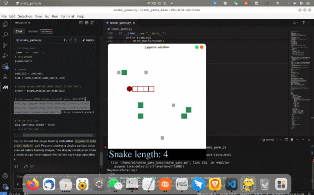以及像魔改遊戲(以貪吃蛇為例),可以在Terminal下載貪吃蛇基礎包後,打開VSCode導入代碼,全選後輸入Prompt: