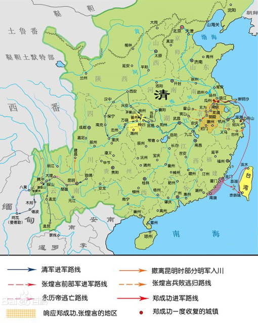 公元1644年清軍入關,李自成的農民軍迅速失敗。清朝控制了中國北方之後,就開始了十幾年消滅南明的戰爭。整體來説南明由於內訌不斷,兼之軍事實力處在下風節節敗退,但是偶爾也有反擊成功的時候。