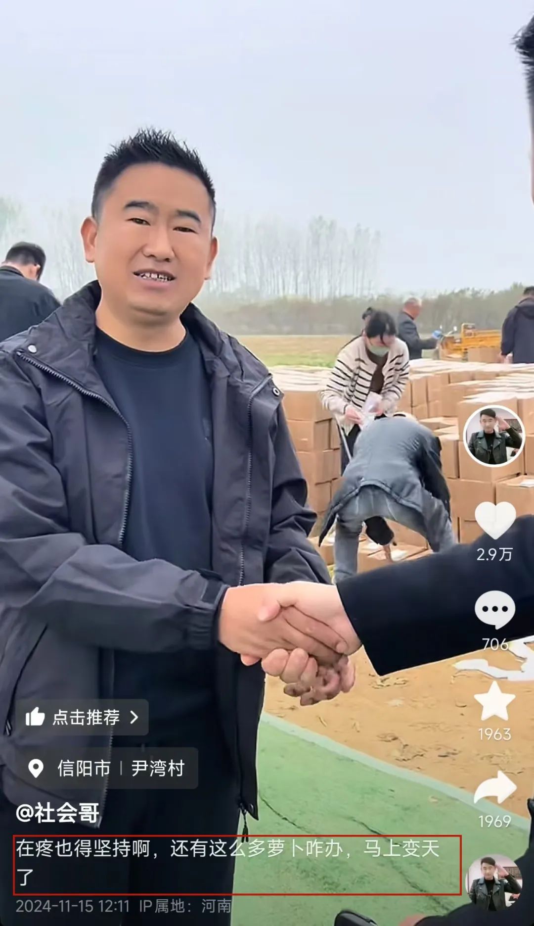 其2024年11月15日發佈的視頻配文:“再疼也得堅持啊!還有這麼多蘿蔔咋辦,馬上變天了。”