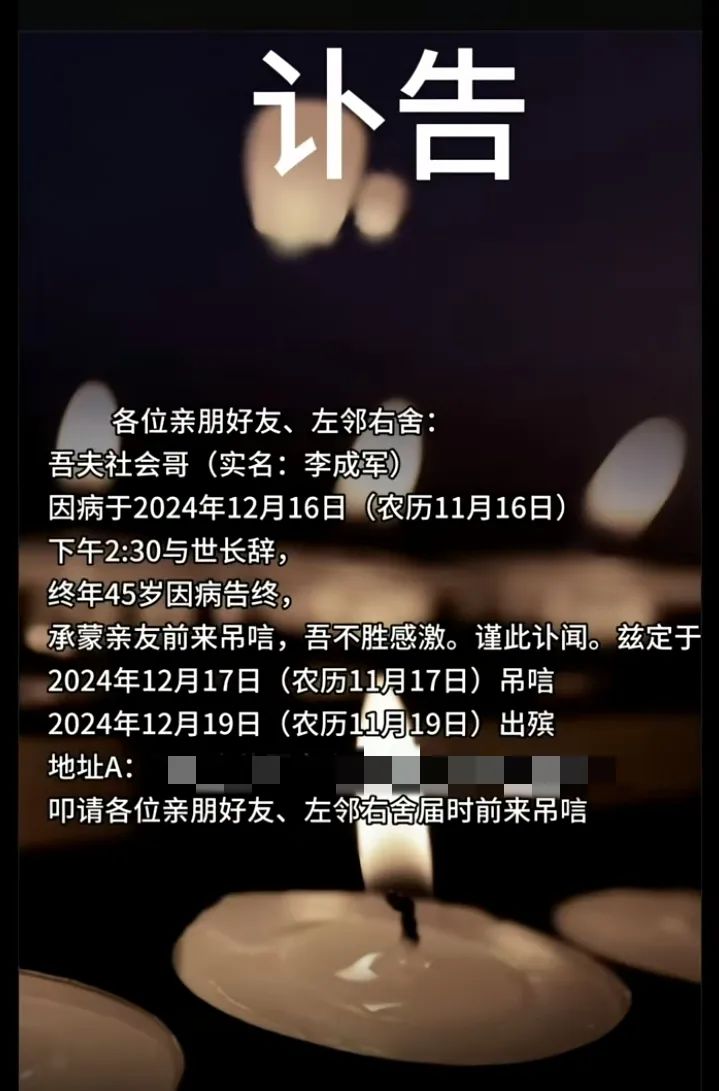 在同一天,“社會哥”的妻子發佈一條訃告,稱“社會哥”已經與世長辭。