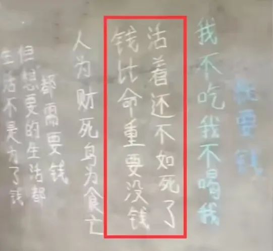 他的住所堆滿了酒瓶,牆上還寫着“錢比命重要,沒錢活着還不如死了”。