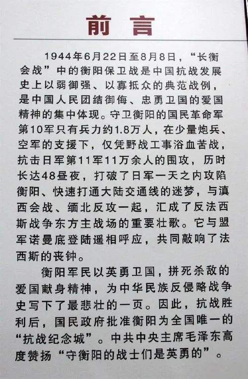 歷史事實是:在抗日戰爭接近尾聲的時候,衡陽保衞戰的失敗絕不是如這篇前言所誇誇其談的那樣是什麼“重要壯歌”,而是作為整個豫湘桂大潰敗的一部分,重創了中國在世界反法西斯陣營中的聲譽,其直接影響,就是中國完全被排除在分割二戰勝利果實(劃分戰後勢力範圍)的雅爾塔會議之外,一個至今仍然無法改變,並令國人難以釋懷的地緣政治後果,就是外蒙的獨立。
