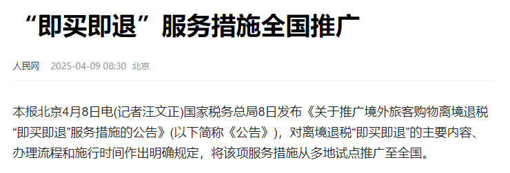 主要是國家税務總局放了個大招——離境退税“即買即退”在全國推廣。