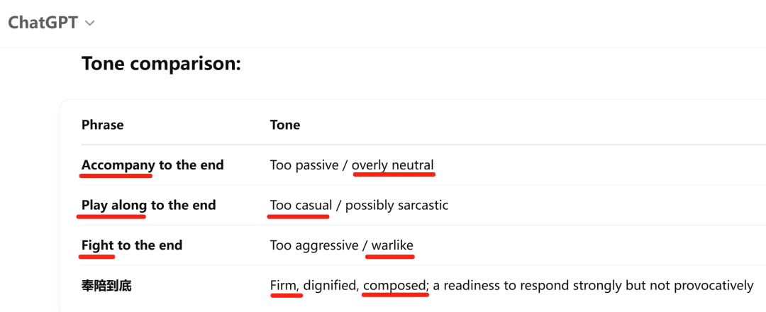 相比而言,“fight”最激烈,像是披甲上陣、刀光劍影(warlike);“play along”則一派口語化(casual),像是在説“好啊,那就走着瞧”;“accompany”則温吞中性(neutral),少了強硬與堅定。在中美貿易戰語境下,相比於直白粗糲地説“跟你幹到底”,“奉陪到底”既有文化的講究,又兼具從容(composure)與堅定(firm),自帶一股不動聲色的鋒芒——不是挑釁,卻絕不退讓;不是主動出擊,卻也不會缺席。
