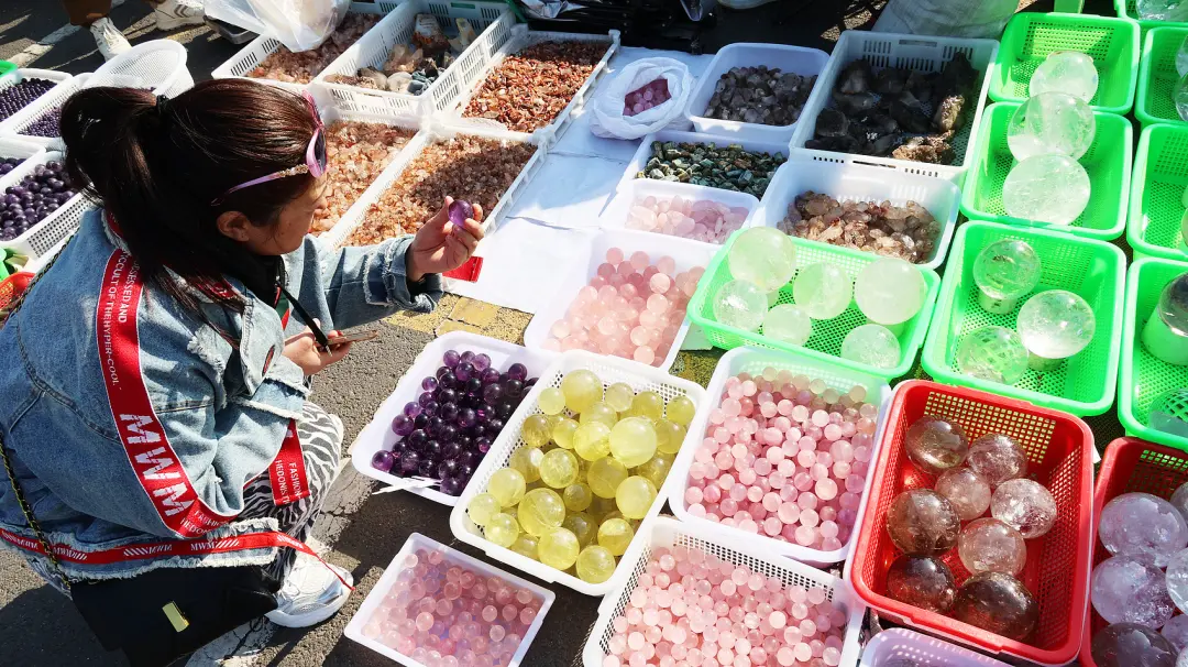 顧客在江蘇東海縣的水晶大集上選購水晶製品。(圖/視覺中國)