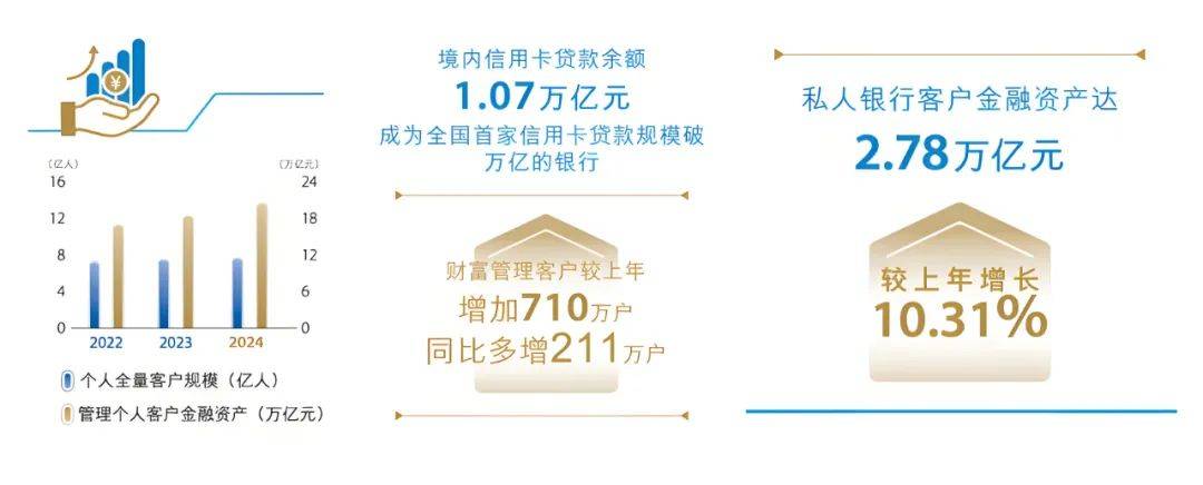 2024年財報提到,在推動“洞察升級”方面,建設銀行打造資產負債綜合視圖,助力對私客户經理開展一站式綜合服務;在推動“貨架升級”方面,推出產品優選和精準畫像工具;在“權益升級”方面,做出了創新研發貴金屬優惠券等金融權益的亮點,全年累計回饋4.28億人次;在推動“運營升級”和“工具升級”方面,分別建設企業級集約化營銷運營能力、打造“幫得”客户經理智能助理。這樣的全方位升級,保證了建設銀行每一個細分產品都能為客户提供專業的金融支持。