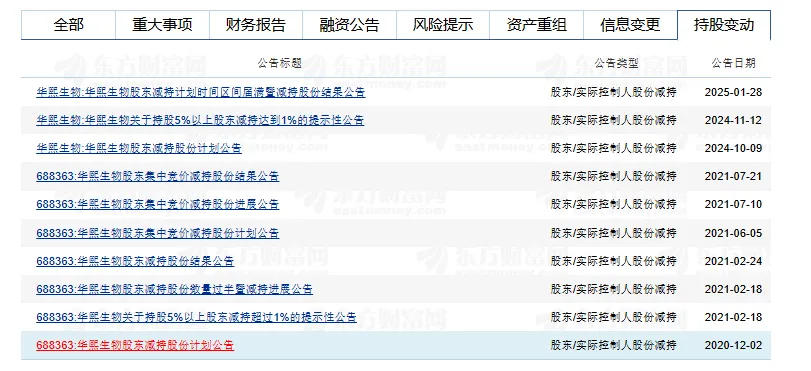 據東方財富網的數據統計,自2020年至今,華熙生物一共發佈了10次與大股東減持的相關的公告。