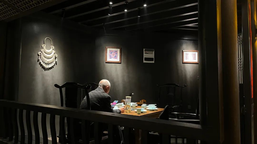 踏入餐廳,一座按精準比例復刻的苗寨風雨橋率先映入眼簾,緊接着便是那連片的吊腳樓羣。這些建築皆由大量木料精心搭建而成,每一寸木紋都散發着歲月沉澱的古樸氣息。頭頂上方,銅鼓燈高高懸掛,散發出柔和而温暖的光芒。店內四處,銀飾在燈光下閃爍着細碎光芒,蠟染裝飾則以其獨特的圖案與色彩,為整個空間增添了濃郁的民族風情,讓人仿若瞬間穿越時空,置身於黔東南那寧靜而迷人的苗家村寨之中。