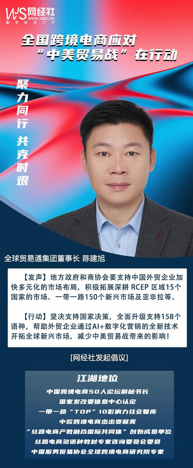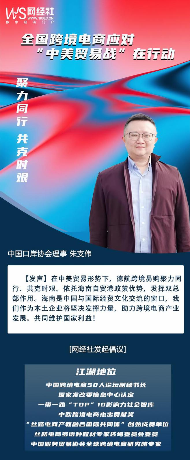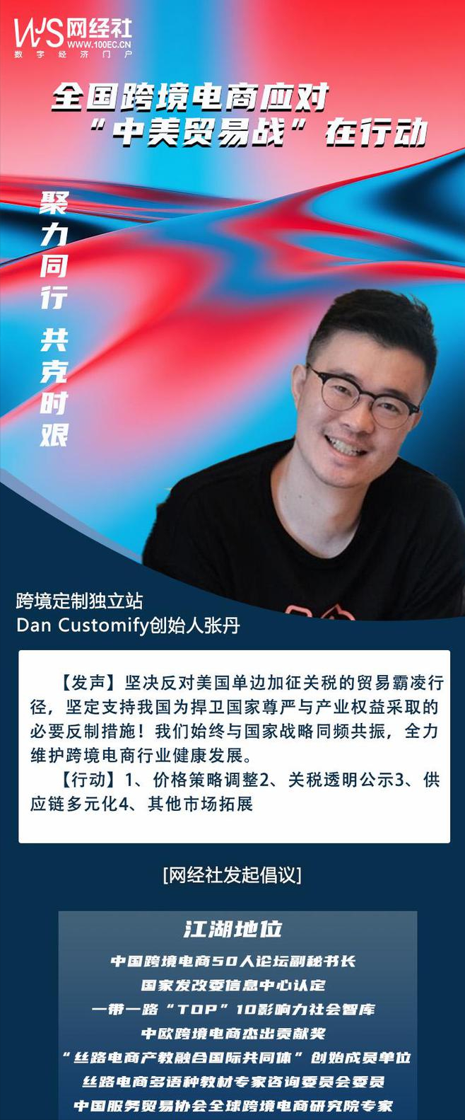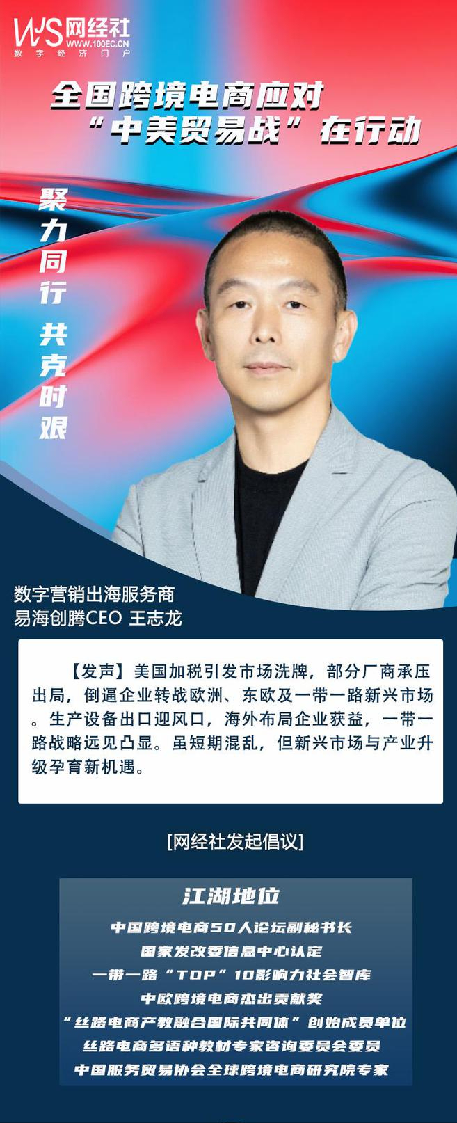 針對美國無理挑釁,對我國進出口特別是跨境電商企業的影響,為凝聚中國跨境電商行業全體共識和力量,共同應對嚴峻挑戰,作為“一帶一路TOP10影響力社會智庫”、“中國跨境電商50人論壇”副會長單位、“絲路電商產教融合國際共同體”創始單位——網經社啓動:“聚力同行,共克時艱:跨境電商應對中美貿易在行動”主題策劃。特邀請全國跨境電商平台、賣家、服務商、協會等表態度與講對策。