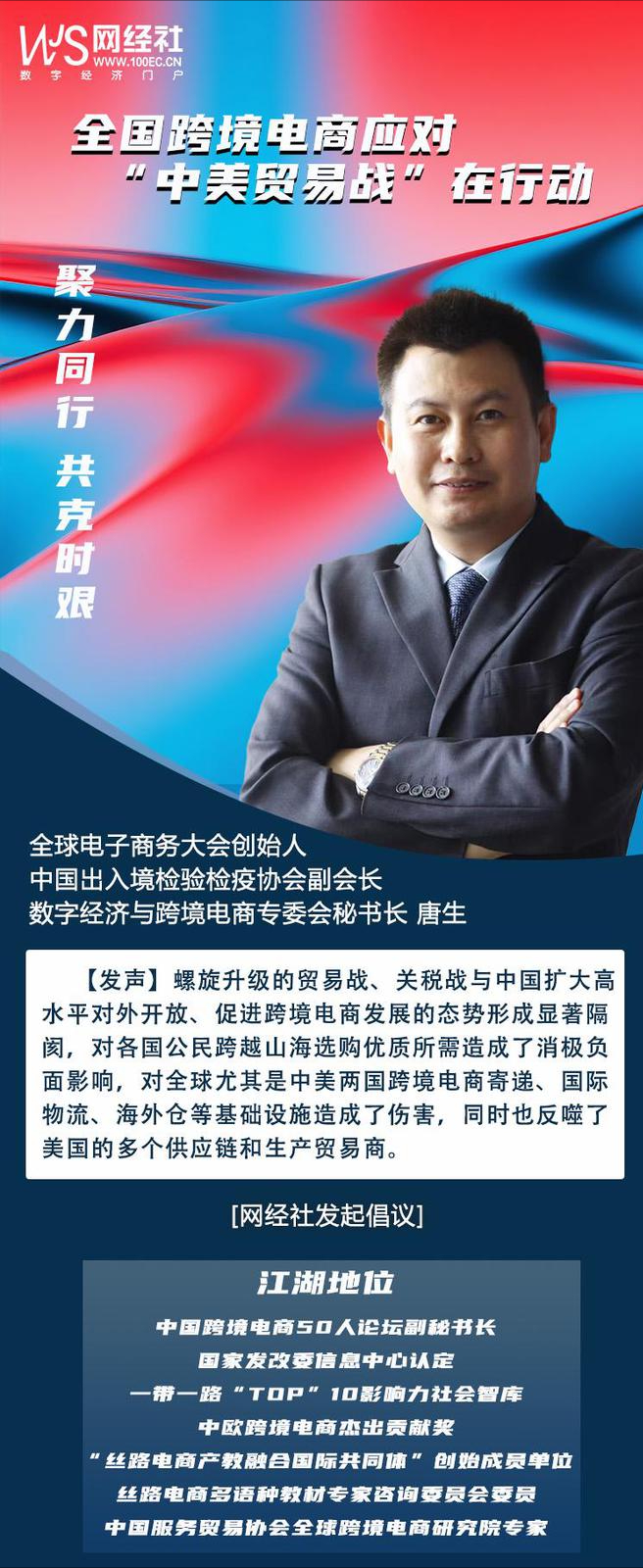 1、全球電子商務大會創始人、中國出入境檢驗檢協會副會長、數字經濟與跨境電商專委會秘書長唐生
