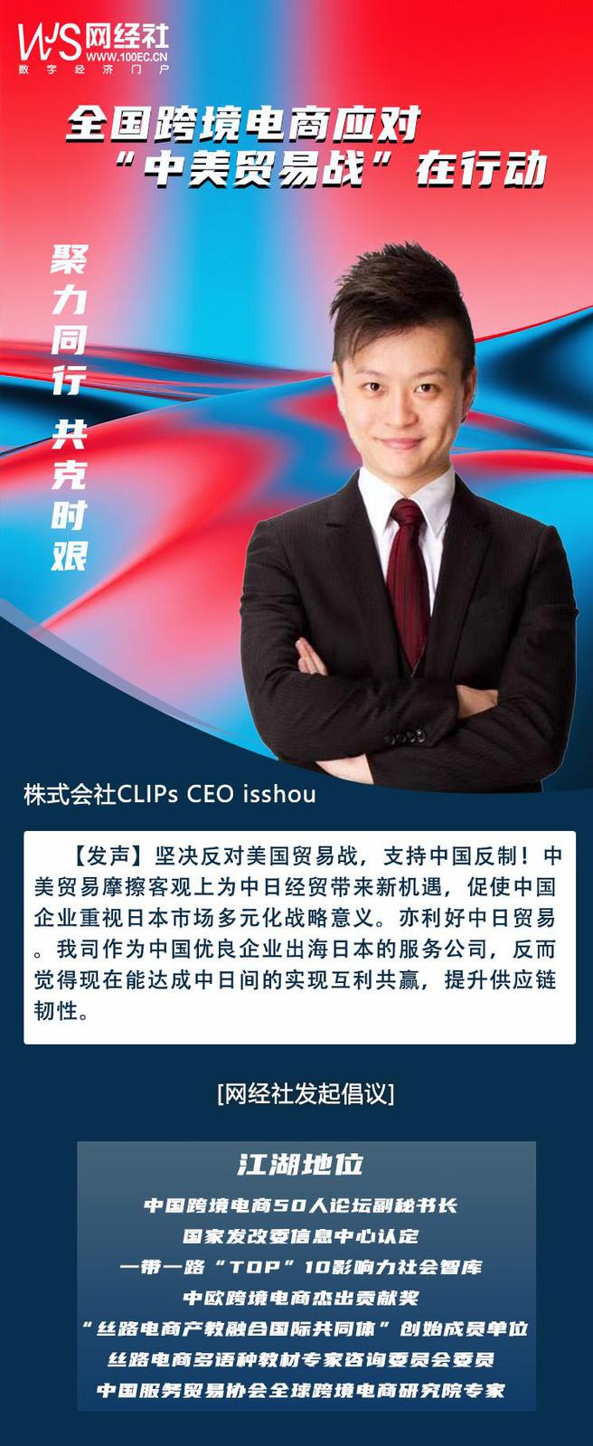 **【發聲】**堅決反對美國貿易戰,支持中國反制!中美貿易摩擦客觀上為中日經貿帶來新機遇,促使中國企業重視日本市場多元化戰略意義。亦利好中日貿易。我司作為中國優良企業出海日本的服務公司,反而覺得現在能達成中日間的實現互利共贏,提升供應鏈韌性。