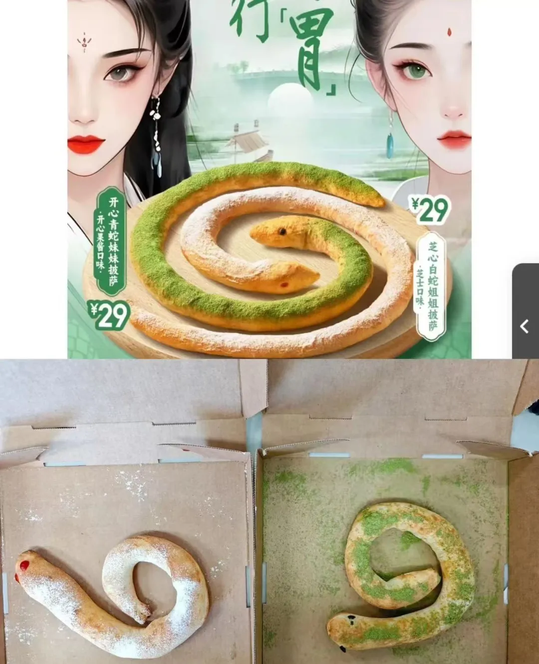前不久愚人節的必勝客限定新品可是真抽象到沒邊了,新推出的“雙蛇姐妹雙修披薩”簡直讓愛吃披薩不愛吃披薩、喜歡白蛇青蛇故事甚至是愛不愛搞抽象的人都沉默了**。芝士夾心的芝心白蛇姐姐和開心果醬開心青蛇妹妹披薩交織在一起,乍一看真的很難發出違心的誇讚,但不得不承認的是,這款限定披薩真的憑藉抽象狠狠地出圈了**,畢竟當代年輕人誰能拒絕會“整活”的披薩啊,這多少不得買個來嚐嚐?