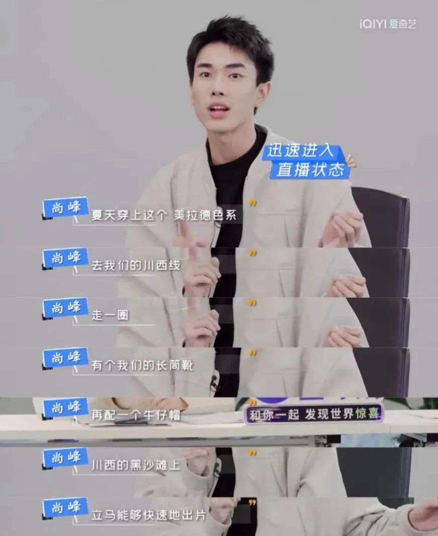 電視台新聞主播、頭部電商公司百萬帶貨主播尚峯結合產品的適用場景及產品特性,在現場進行衝鋒衣的“虛空種草”。