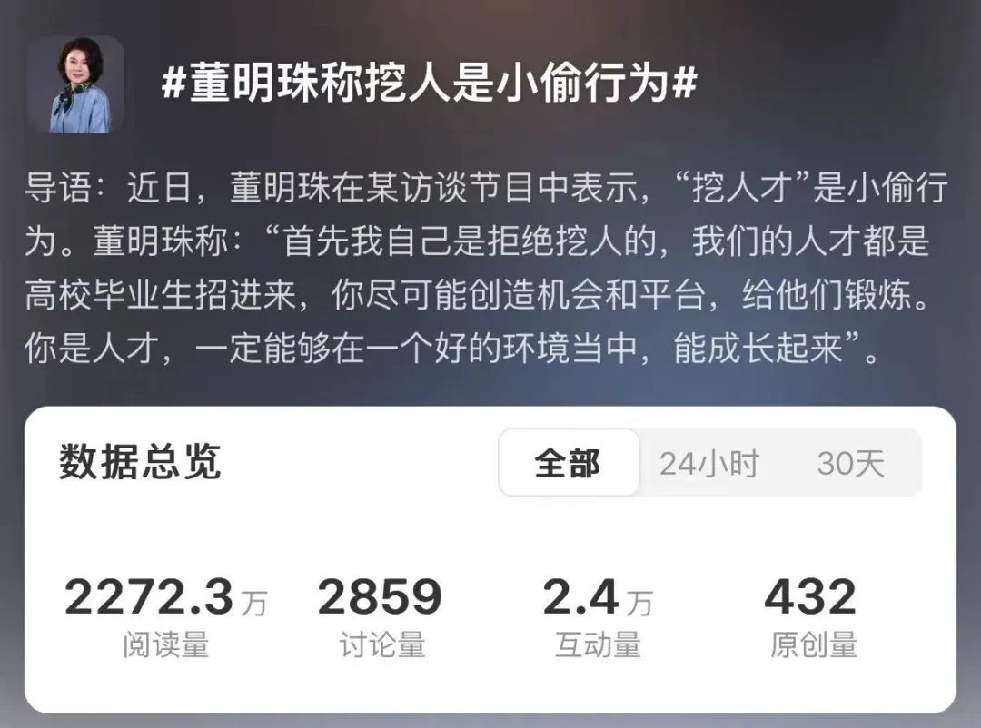 和孟羽童“鬧掰”的董明珠,隨着其諸多站在“打工人”對立面的發言流出,個人形象與企業形象都受到不小影響。曾經節目中的知人善任、雷厲風行也變成了“資本家的偽裝”。