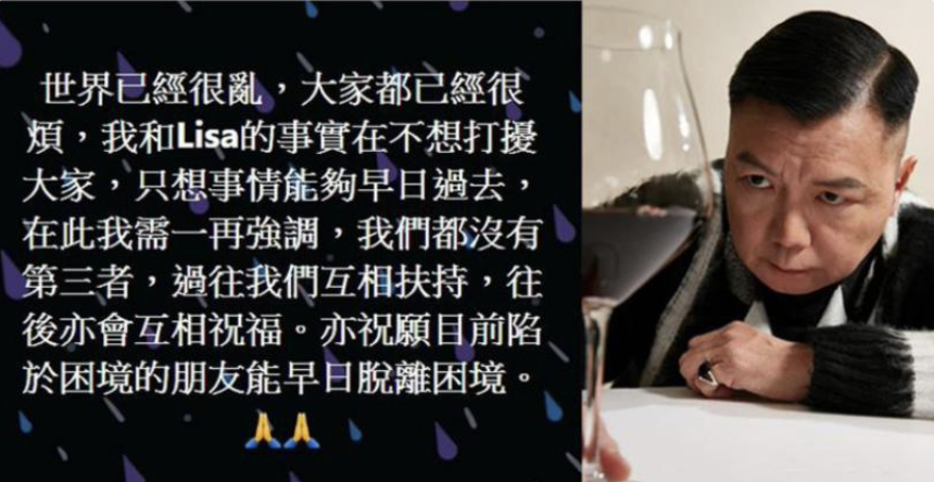 至於是否涉及第三者,他坦率回應:“我們之間沒有第三者,往後的日子,須各自重新出發,獨自上路,互相祝福。”