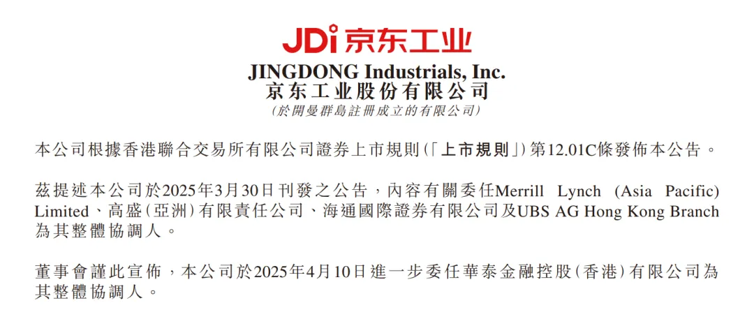 4月11日,港交所文件顯示,京東工業股份有限公司進一步委任華泰金融控股(香港)有限公司為整體協調人。據此,截至公告日期,京東工業已委任美銀證券、高盛、海通國際、UBS、華泰國際為整體協調人。