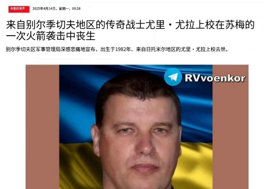 其次我們看到轟炸現場有很多軍人,我們看到有死者穿着烏克蘭軍服,而且非常巧合的是,報道4月14日公開報道烏克蘭傳奇人物尤拉上校在蘇梅遭遇火箭彈襲擊生亡。我們要知道烏克蘭的上校級別高官一般都是在遠離前線的地區,普通火箭彈根本無法對其進行打擊。尤拉上校的另一個身份也被爆料為其是烏軍第27火箭炮旅旅長。與此同時我們看到轟炸現場出現了標有烏克蘭軍隊戰術標記的皮卡車。這個也讓我們對烏克蘭一方表述的平民產生了更多的懷疑。