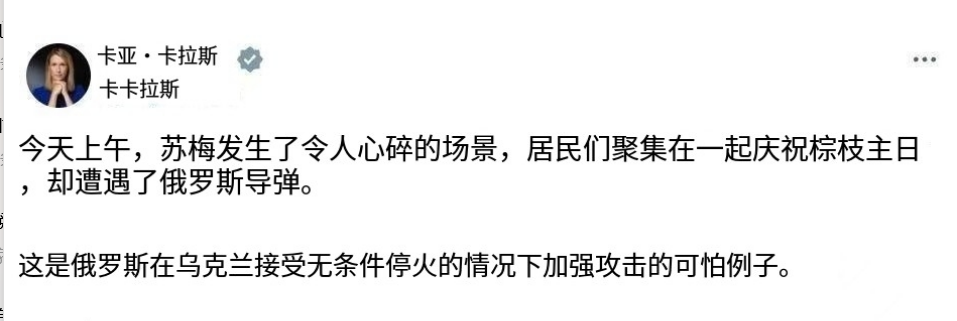 歐盟外長卡拉斯表示今天上午蘇梅發生了令人心碎的場景,居民們聚集在一起慶祝棕枝主日卻遭遇了俄羅斯導彈。這是俄羅斯在烏克蘭接受無條件停火的情況下加強攻擊的可怕例子。