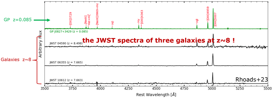 ▲圖3:JWST首批釋放的早期宇宙(宇宙年齡約6.5億年處)年輕星系的光譜與近鄰宇宙(宇宙年齡約126億年處)“綠豌豆”星系高度相似
