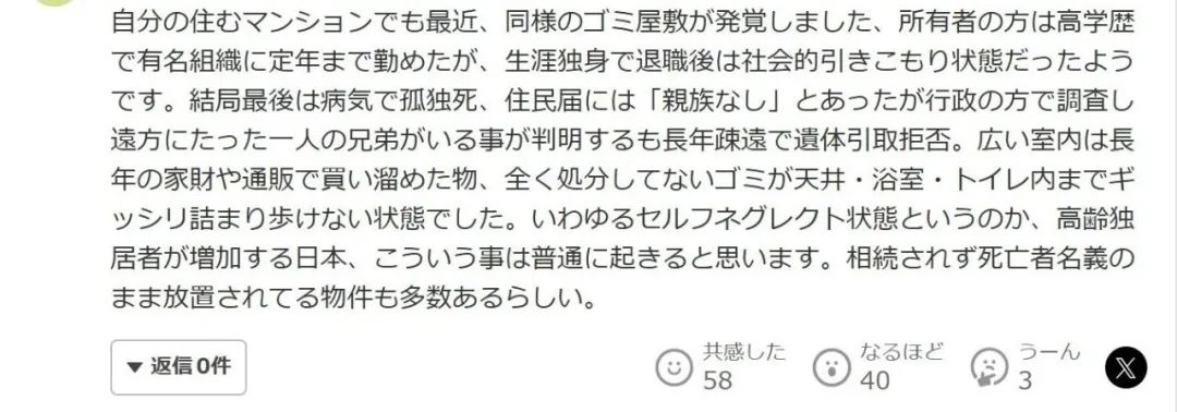 (自己住的公寓最近也發現了同樣的垃圾屋,所有者以高學歷在有名的組織工作到退休,但一生獨身,退休後處於社會的家裏蹲狀態。結果最後因病孤獨死。居民報告上説“沒有親屬”,行政方面進行了調查,遠方還有一個兄弟,由於長年疏遠而拒絕認領遺體。在寬敞的室內,長年的家產和郵購時積攢的東西,完全沒有處理的垃圾一直堵塞到天花板、浴室、廁所內,無法行走。也許這就是所謂的自我忽視狀態吧,高齡獨居者增加的日本,這樣的事情很普通。不被繼承而以死亡者的名義放置的房子好像也有很多。)