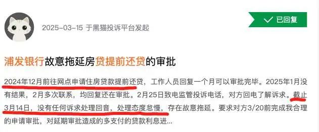 3月15日,黑貓平台上有用户投訴稱“浦發銀行故意拖延房貸提前還貸的審批”。