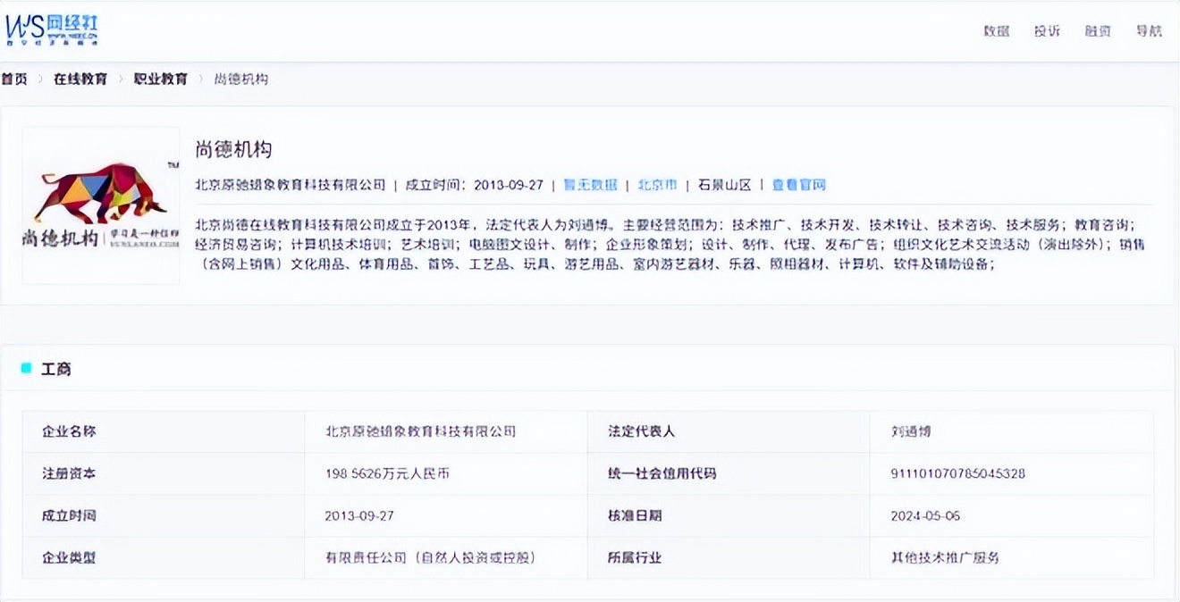 據網經社企業庫顯示,尚德機構是北京尚德在線教育科技有限公司,成立於2013年,法定代表人為劉通博。