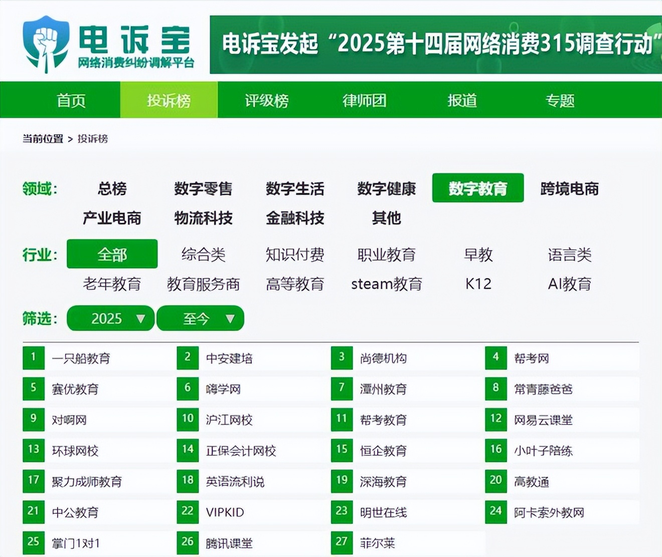 2025年至今,“電訴寶”受理投訴中涉及的數字教育領域用户有效投訴顯示(依據投訴量排行),“尚德機構”排名第3位。最新評級為“不予評級”。除此之外,其他被投訴的類似平台還有:一隻船教育、中安建培教育、幫考網、賽優教育、嗨學網、 中安建培、潭州教育、滬江網校、 幫考教育、常青藤爸爸、 對啊網、環球網校、網易雲課堂、 正保會計網校、 恆企教育、 聚力成師教育、 高教通、中公教育、阿卡索外教網、 VIPKID、明世在線、 小葉子陪練、深海教育、掌門1對1、英語流利説、 菲爾萊。