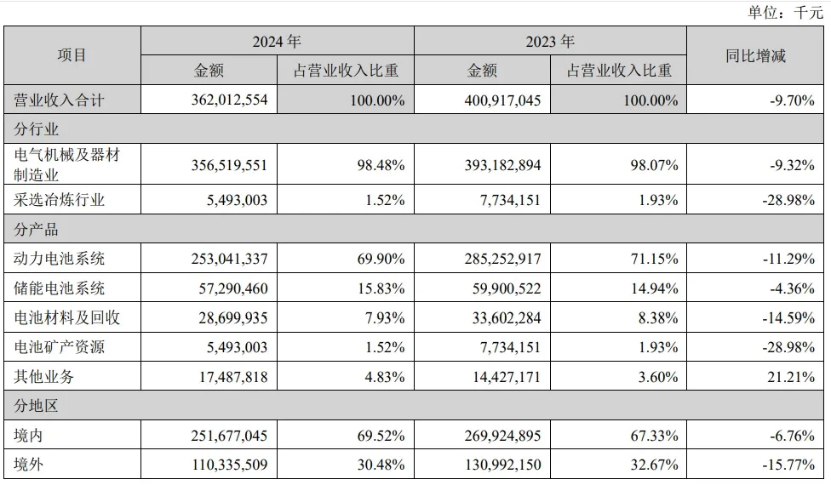 細分到具體業務,動力電池業務依然是收入大頭,佔總營收的69.9%,但去年這部分收入同比下降了11.29%。這跟新能源汽車行業的發展情況,以及鋰電產業鏈的供需情況有關。