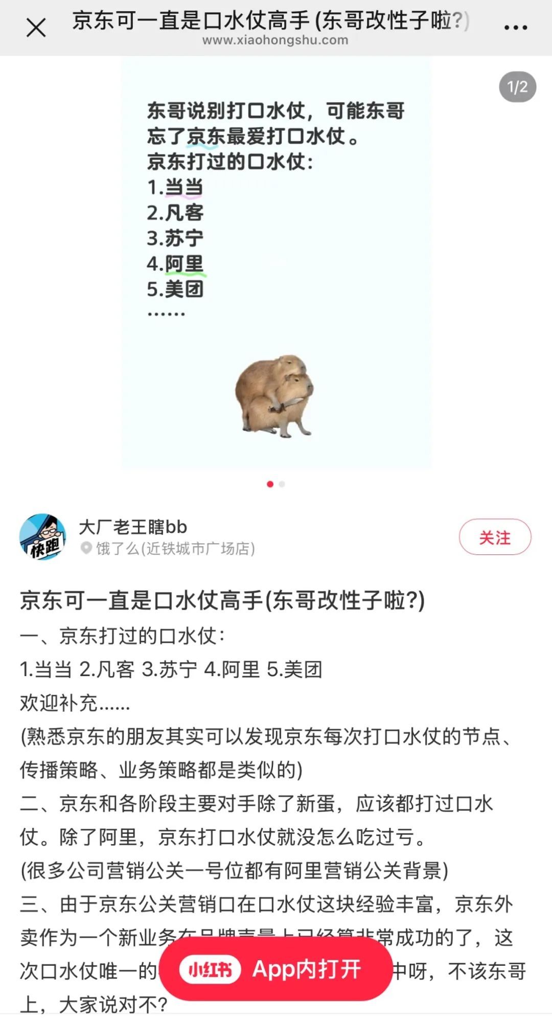 強調“不打口仗”的大強子用一輛ET9訂單換到了“到處加電”的斌哥一條微博,強調京東“正在認真做外賣”。此前,他在一個新註冊微信抨擊了不給兄弟們交養命錢的其他平台,於朋友圈強調“期待各階層一起幸福”。