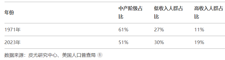 根據皮尤研究中心的數據,美國中產階級(按家庭收入定義)比例從1971年的61%下降到2023年的51%。同時,低收入和高收入人羣比例都有所上升,其中高收入人羣佔比由1971年的11%增加到19%。