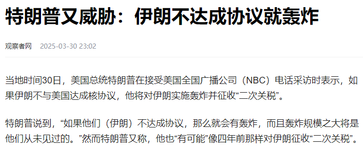 3月30日,特朗普在接受美國全國廣播公司(NBC)電話採訪時説道:“如果他們(伊朗)不達成協議,那麼就會有轟炸,而且轟炸規模之大將是他們從未見過的。”