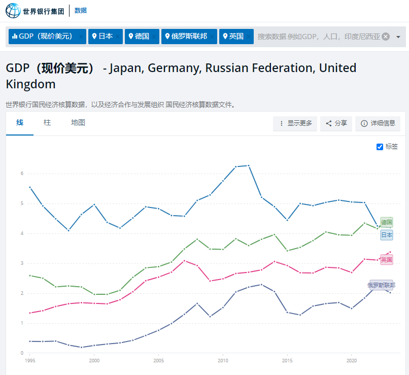 我們來看看《世界銀行》公佈的數據:以德國、日本、俄羅斯和英國為代表的傳統工業強國,在近30年裏的GDP並沒有增加多少。